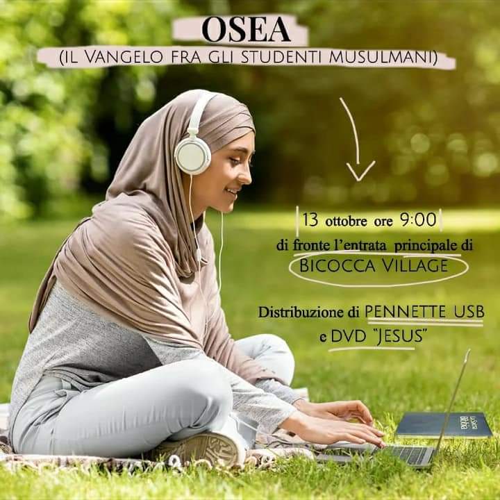 La visione OSEA (Opera di Supporto ed Evangelizzazione fra gli Arabi) attraverso la sinergia R.E.M. e Islamecom, vi invita a partecipare al prossimo evento evangelistico che avrà luogo a Milano il 13 Ottobre alle ore 9:00 presso il Bicocca Village. Un tempo di dialogo e condivisione del Vangelo con studenti musulmani. Preghiamo per un risveglio nel mondo arabo!