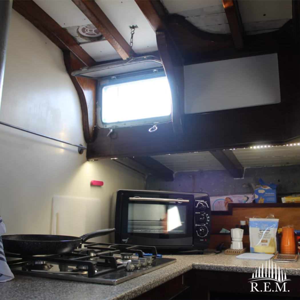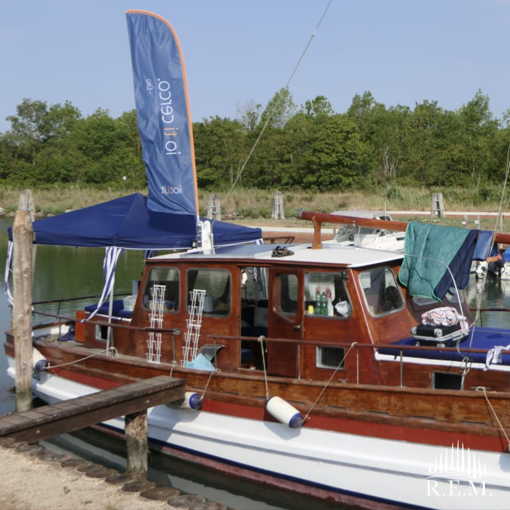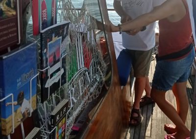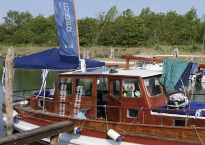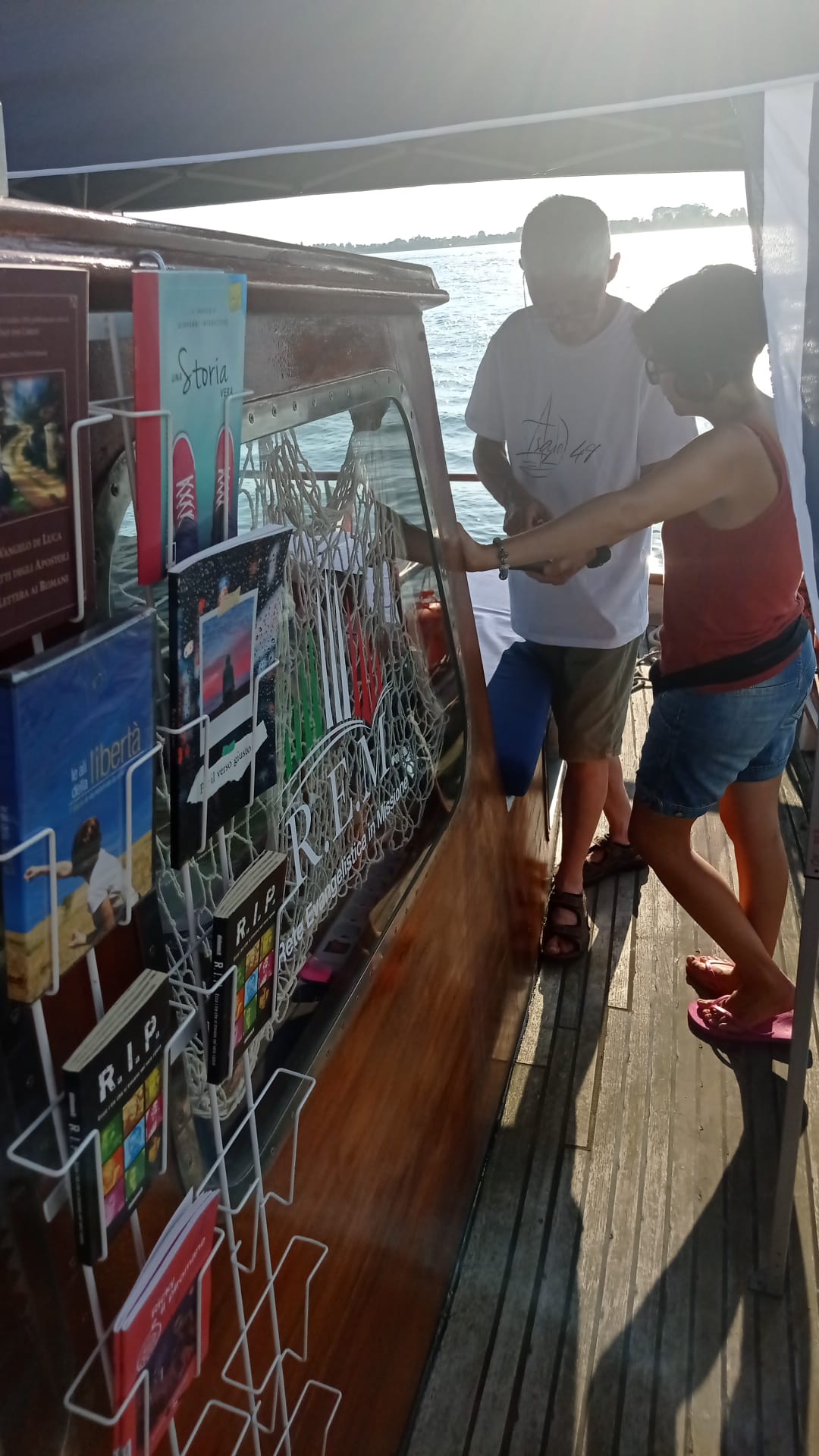 La barca è inoltre munita esternamente di un’apposita scaffalatura per accogliere la libreria.
